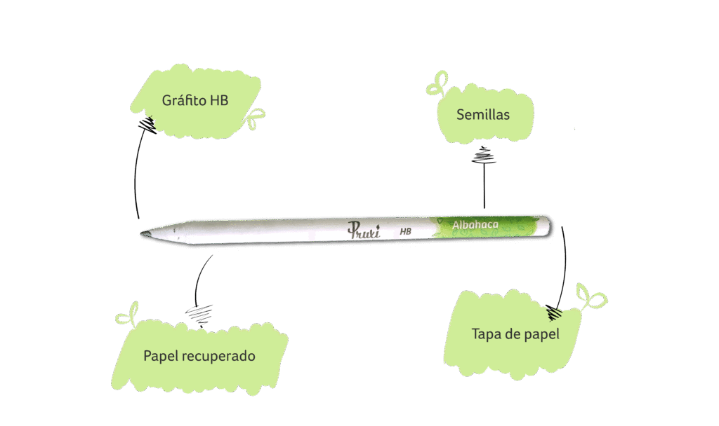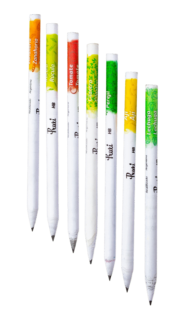 Fabricamos lápices realizados con papel reutilizado. A su vez, estos contienen en su cabo semillas de diferentes tipos de plantas, para que al finalizar la vida útil del lápiz puedas plantarlas y crear tu propia huerta.